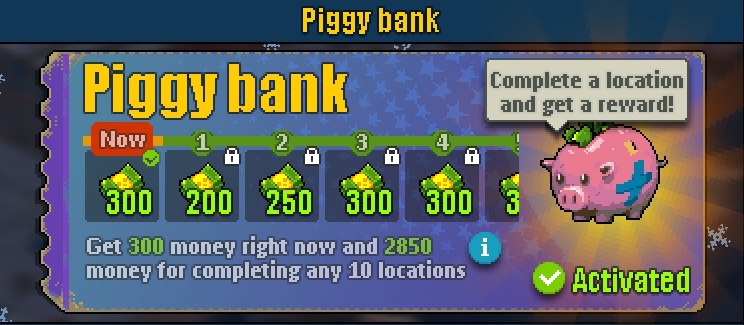 Копилка дает мгновенную награду в виде денег сразу после покупки, а также дополнительные награды за полное прохождение локаций (вы получаете 300 денег сразу и до 2850 по мере прохождения локаций 1-10).